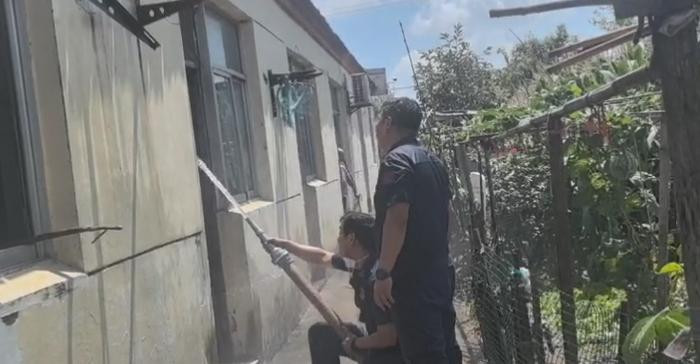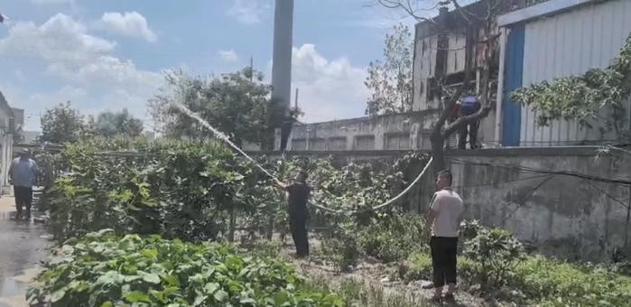 第一时间发动我们企业内的员工,利用室内消火栓进行水带的连接,准备布设水带进行扑救。我们将水带铺设好之后,翻到围墙外,把水带布设到民房前侧,通过民房的户门,有效控制了明火进一步向周边蔓延。